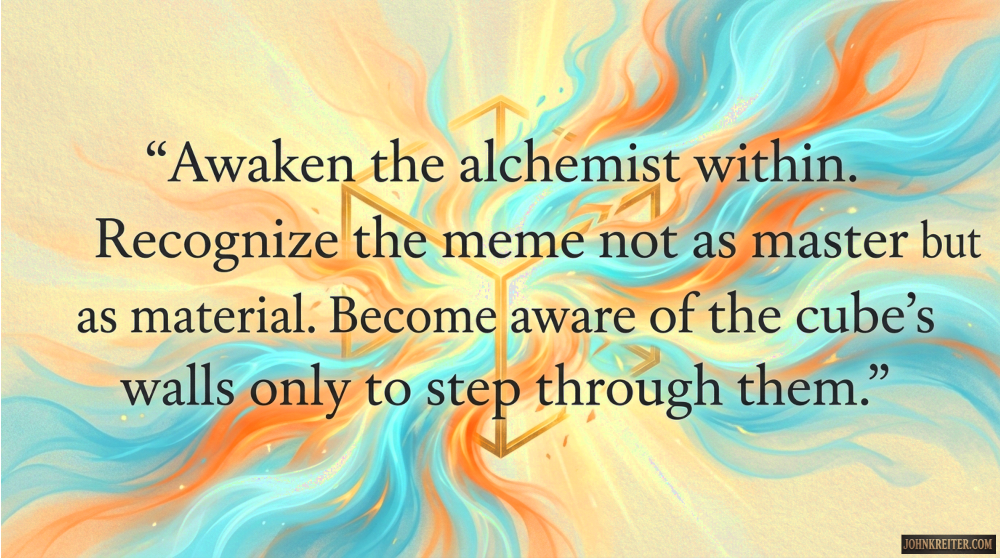 And so the task, eternal and immediate, is simple: awaken the alchemist within. Recognize the meme not as master but as material. Become aware of the cube’s walls only to step through them. Then perhaps, when the Archon hums its endless lullaby, you will smile knowingly… because you have already walked beyond the door.